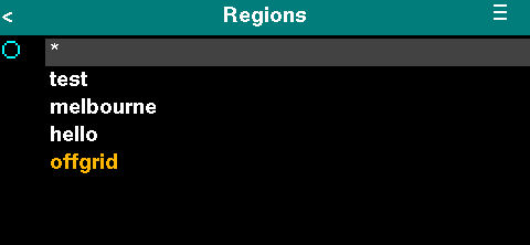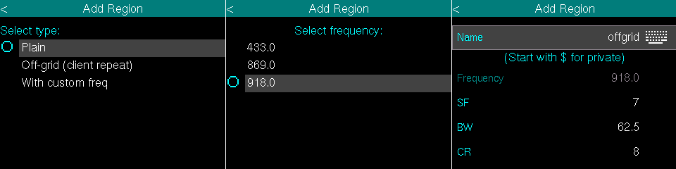 The ‘plain’ regions are the current ones for use with the ‘Set Scope’ feature. The other two types now also let you define custom radio settings, but the ‘Off-grid’ one enables the client repeat mode. Also, the Off-grid type only lets you select from a number of reserved frequencies*, where as the third type lets you specify any frequency (but does not enable client repeat mode).