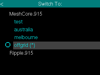 To go back to the public mesh, just select the network profile (eg. the white ‘MeshCore.915’ above).