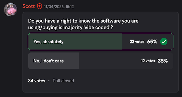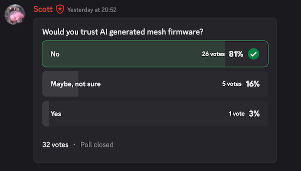 We ran a poll recently, and asked in the MeshCore Discord about AI and trust, and these are the results: